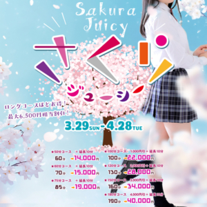 本指名料(会ったことのある子を指名)2,000円※「さくらジューシー」のご予約は、電話予約は朝8時30分より、WEB予約は朝9時より受付いたします。